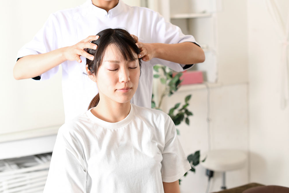 こめかみから頭頂部に向かって、指先で軽く押し上げるようにマッサージします。